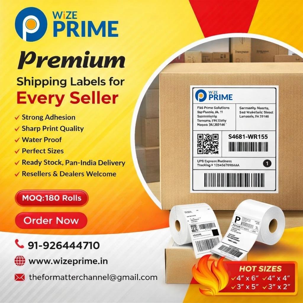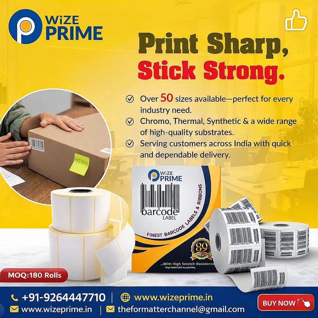Wize Prime barcode labels rolls for packaging and shipping – high quality chromo, thermal and synthetic barcode stickers available in 50+ sizes in India