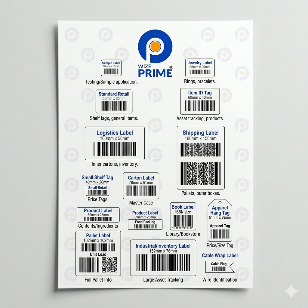 Wize Prime barcode labels rolls for packaging and shipping – high quality chromo, thermal and synthetic barcode stickers available in 50+ sizes in India